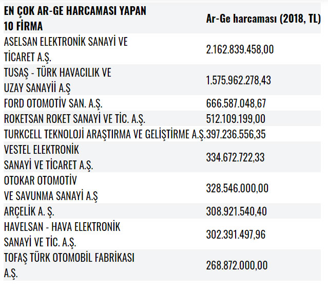 Turkishtime tarafından hazırlanan “ AR-GE 250, Türkiye’nin En Çok AR-GE harcaması yapan şirketleri” araştırmasına göre 2018 yılında en fazla AR-GE harcaması yapan şirket, 2.162.839.458 lira ile ASELSAN oldu. Bu rakam geçen yıl 1 milyar 674 milyon TL’ydi. ASELSAN, toplam cirosunun dörtte birini (Yüzde 24) Ar-Ge’ye ayırıyor.