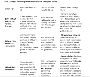 Özetle, Türkiye güçlü bir siyasi irade ile yerli sanayi katılımını raylı sistemlerde artırma yönünde adımlar atmış, ilk başarı örneklerini tramvay/metro araçlarında görmüş, yasal engelleri büyük ölçüde kaldırmıştır. Yerli sanayinin güçlü olduğu alanlar (ör. altyapı inşaatı, temel vagon gövdeleri, mekanik parçalar) ile zayıf olduğu alanlar (yüksek hızlı teknolojiler, sinyalizasyon yazılımı, kritik elektronik aksam) bellidir. Bu değerlendirme ışığında, her alt sektör için ayrı stratejiler geliştirmek gerektiği anlaşılmaktadır. Aşağıdaki bölümde her sistem tipi için uygulanabilir sanayi katılımı stratejileri detaylandırılacaktır.
