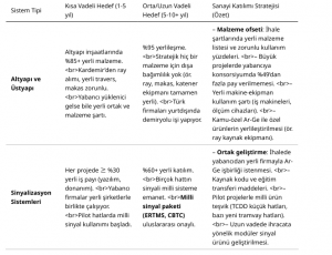 Önerilen modelin somut bir özeti olarak, her bir alt sistem için kısa ve uzun vadeli yerlilik hedefleri ile stratejileri içeren bir tablo hazırlanabilir: