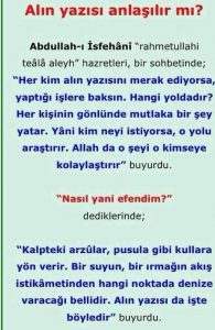 Hikmet Ehli diyor ki; Herkesin yaptığı iş, alın yazısının gereğidir. İnsanın alın yazısı icraatıdır. O hâlde herkes, kendi alın yazısını, yaptığı işe bakarak okuyabilir. İnsanlar, yaşayışıyla, karakterleriyle, aklından geçenlerle, konuşmasıyla, hedefleriyle, en çok yapmak istedikleri ve yaptıkları icraatlarıyla kaderini belirler. Kalpteki arzular pusula gibi insanların kaderine yön verir. Alın yazısı da işte böyledir.