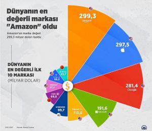 Dünyanın en değerli markası, bu yıl yaklaşık 299,3 milyar dolar marka değeriyle Amazon olurken bu şirketi 297,5 milyar dolar değerle Apple izledi. 281,4 milyar dolar değerle Google takip etti. Geçen yılki listede Apple ilk sırada yer alıyordu.