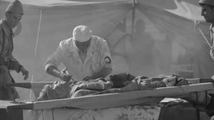Doktor ilk muayeneyi yapıyor ve yaşama olasılığı olan, ameliyat edilmesi halinde yaşayacağına inandıkları askerlere ağrı kesiciyi yapıyordu..